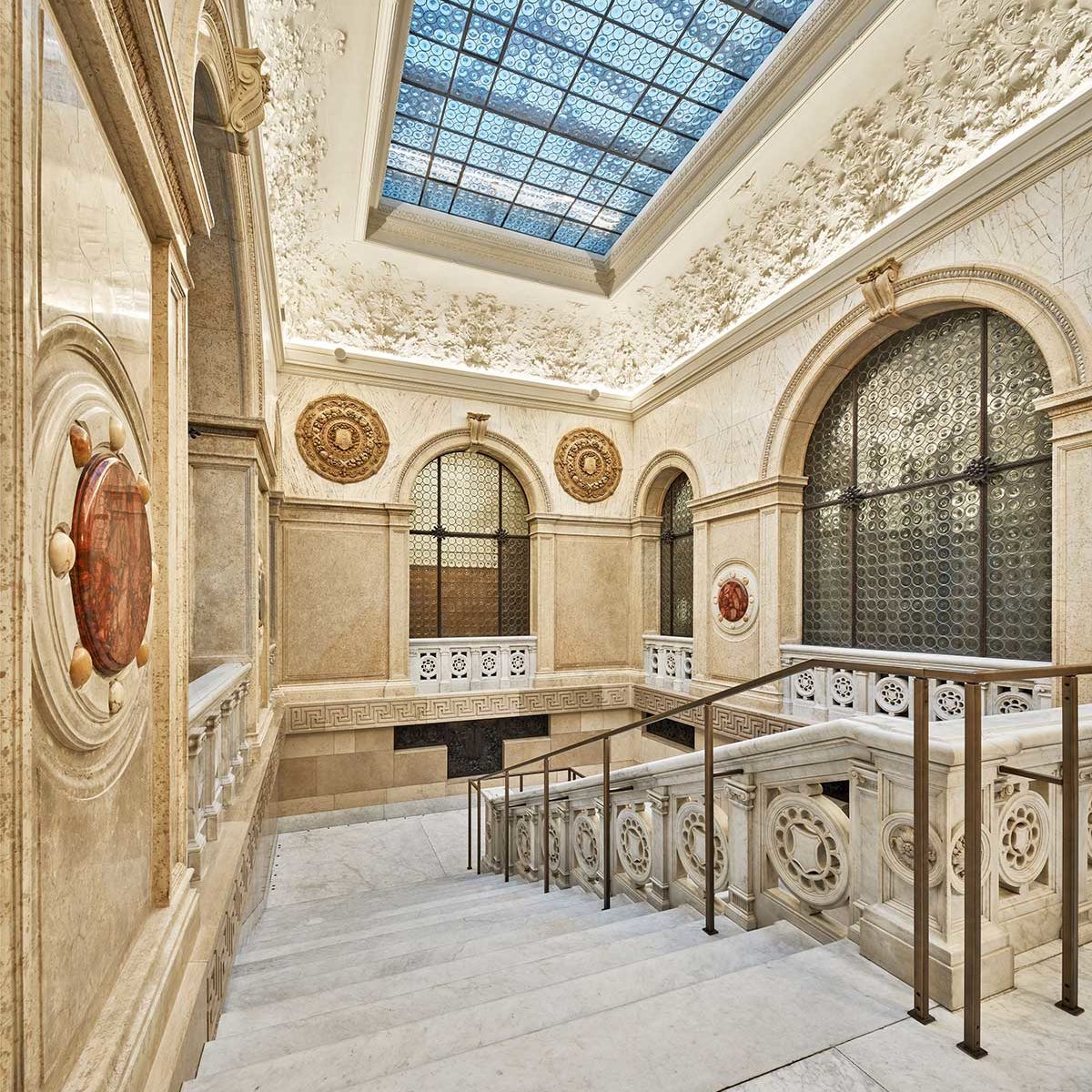 The grandiose entrance leads to the lobby, located opposite the iconic and impressive marble fountain depicting Mercury with three lions drinking, playing with shapes, lights and contrasts that enhance and emphasize the prestigious esthetic.